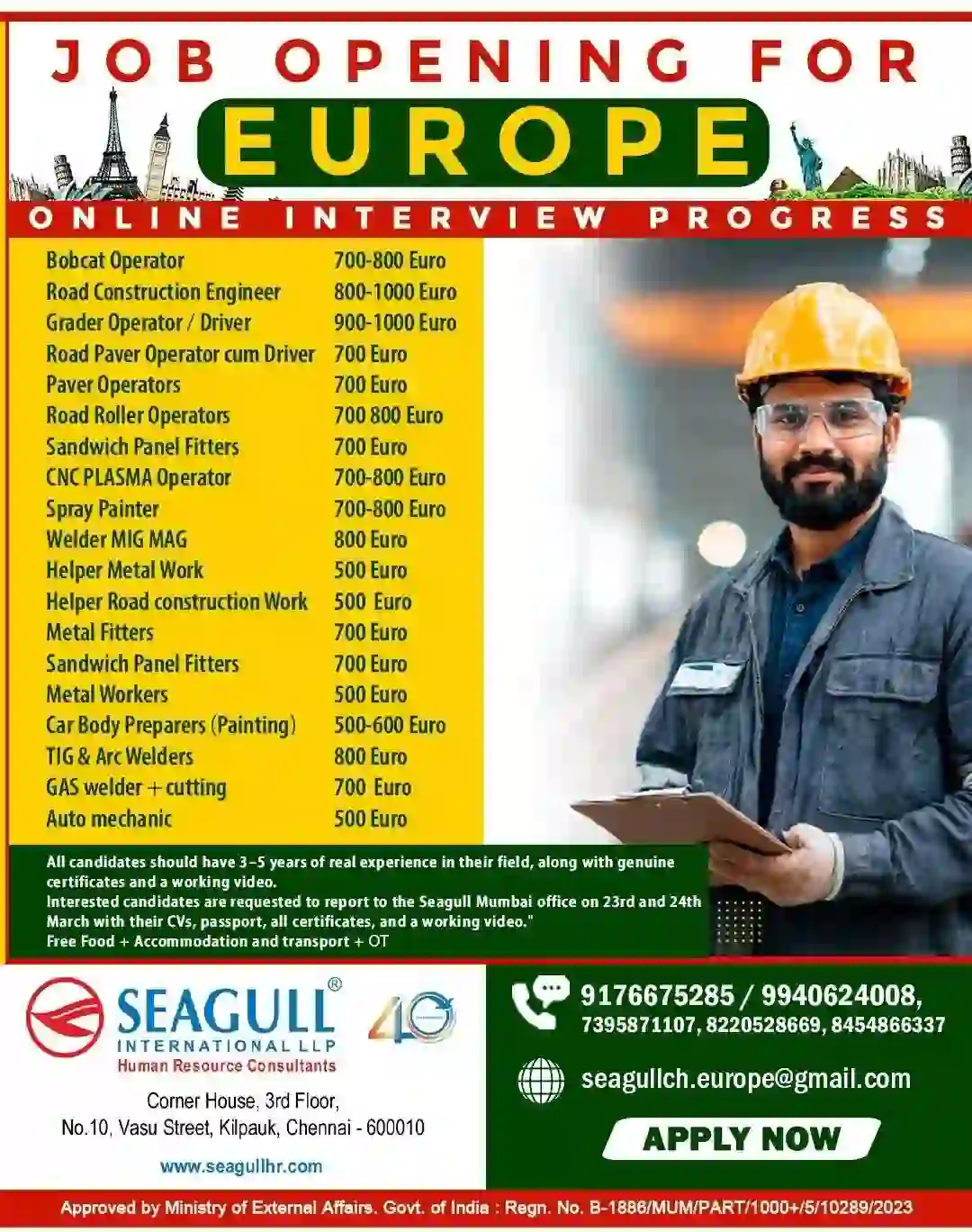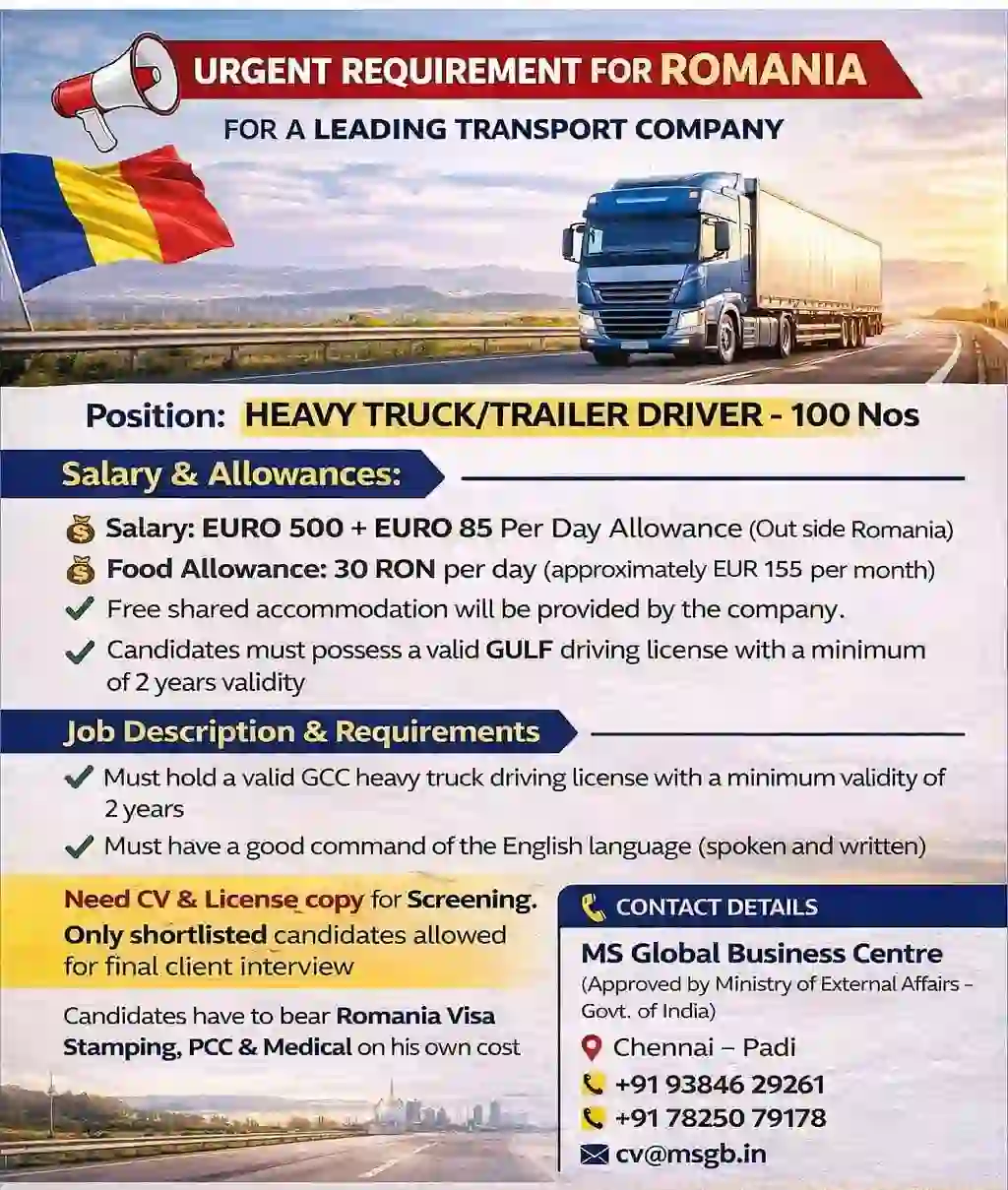 - Europe (Romania & others) – Drivers, Factory Workers, Skilled Labor